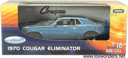 2520BU WELLY 1970 Ford Mercury Cougar Eliminator Scale: 1:18 Dimensions: 10"L x 3.75"W x 2.5"H '70 Mercury Cougar Eliminator die cast car with opening doors and hood, steerable front wheel, and detailed components. Display stand included. Color: Blue