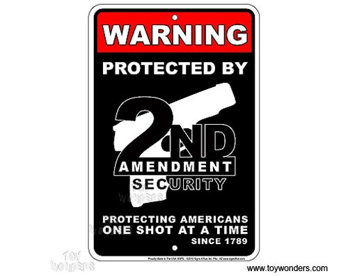 SPSPG3 2nd Amendment Security Warning metal sign. A collection of yesterday's signs. Great for decorating homes, offices, restaurants, etc. Aluminum metal sign. Size approximately is 12" x 8".