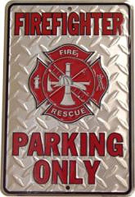 SPSFMD Firefighter Parking Only metal sign. Fire Engine Collector metal signs. A collection of yesterday's signs. Great for decorating homes, offices, restaurants, etc. Lithographed steel metal. Size approximately is 8" x 12".