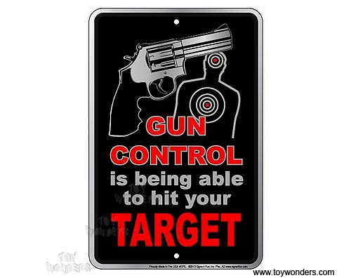 SPSPG4 Gun Control Is Being Able to Hit Your Target metal sign. A collection of yesterday's signs. Great for decorating homes, offices, restaurants, etc. Aluminum metal sign. Size approximately is 8" x 12".