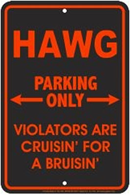 SPSH3R Hawg Parking Only Metal Sign. A collection of yesterday's signs. Great for decorating homes, offices, restaurants, etc. Aluminum metal sign. Size approximately is 8" x 12".