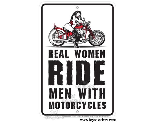 SPSH6 Real Women Ride Men with Motorcycles metal Sign. A collection of yesterday's signs. Great for decorating homes, offices, restaurants, etc. Aluminum metal sign. Size approximately is 8" x 12".