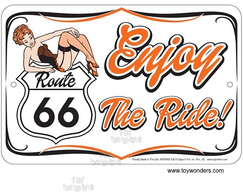 SPSR6E US Route 66 Enjoy the Ride metal sign. Rt 66 Collector metal signs. A collection of yesterday's signs. Great for decorating homes, offices, restaurants, etc. Aluminum metal sign. Size approximately is 8" x 12".