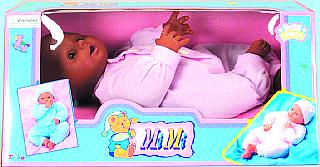 61680B Mi Mi Baby Doll (Black). 15" stuffed bean baby doll. Press its chest it'll say "mama," "papa," laugh or cry. Clothing outfits may vary. "TRY ME" button. Box size: 15.25"Lx7"Wx7"H.
