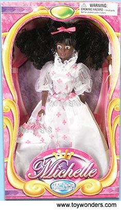 2911B Michelle Doll (Black). 11.5" fashion doll in white princess dress w/ bendable arms & legs & turnable waist. Box size: 8"Lx 2"Wx 13.5"H.