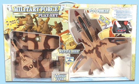 06544 Military Force Set Wire controlled 3 pc set includes battle jeep, tank, & F-14 Tomcat. Remote control offers take-off/landing action, open/close wingspan, & turn movements. 3 "AA" batteries included, 2 "D" batteries not included. Box size: 27.25"L x 6"W x 16"H.