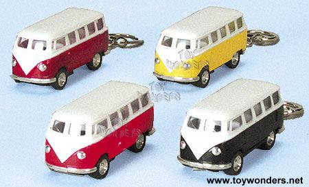 2.5"L die cast metal mini van key chain features pull-back motor action.
