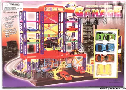 9913 Modern Parking Garage. 3 levels, holds 6 cars, suitable for small scale die cast cars. Includes 3 2.5" die cast cars. Some assembly required. Box size: 16.5" x 11.5" x 2.75".