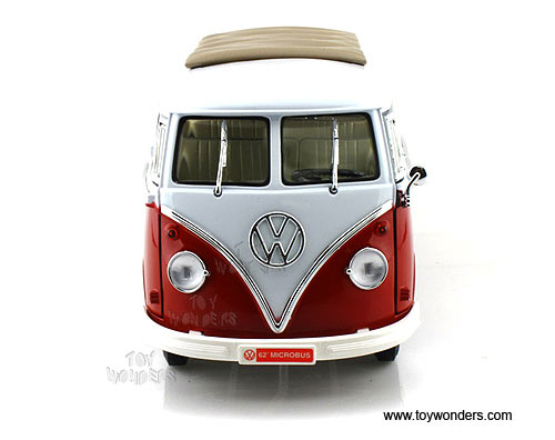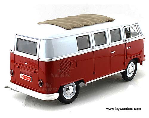 397471 Motor City Coca-Cola - 1962 Volkswagen Samba Minibus. 1:18 scale diecast collectible model car. This Coca-Cola VW Samba Minibus is a 9.5"L x 3.5"W x 3.75"H diecast metal car with openable doors and hatchback. Individually packed in a window box. Window Box measures 14"L x 6"W x 5.25"H. This 62 Volkswagen Samba Minibus is manufactured by Motor City Classics. 397471 is in RED and WHITE two-tone colors.