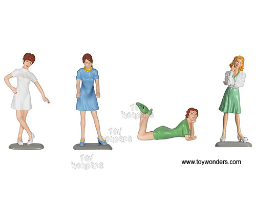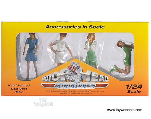 854 Motorhead Miniatures Figurines - 60's Sweeties #2 ,Set of 4. These figures are great for decorating 1:24 scale cars and dioramas. Hand painted cold-cast resin. This set includes four approximately 3" figures. These figures are manufactured by Motorhead. Packed in a window box. Box size: 8"Lx 1.75"Wx 4"H.