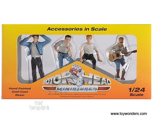 949 Motorhead Miniatures Figurines - Hot Rodders #3 Set of 4. These figures are great for decorating 1:24 scale cars and dioramas. Hand painted cold-cast resin. This set includes four approximately 3" figures. These figures are manufactured by Motorheads. Packed in a window box. Box size: 8"Lx 1.75"Wx 4"H.
