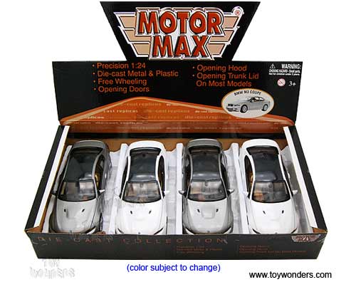 73347D Motormax - BMW M3 Coupe Hard Top. 1:24 scale diecast collectible model car. This BMW M-3 Coupe is a 7.5"L x 3"W x 2.25"H die cast metal car with openable doors & hood. Free wheeling. The BMW M3 Coupe is manufactured by Motor Max Toys (Motormax). 4 pcs per display box in assorted colors. 16 pcs per inner box.