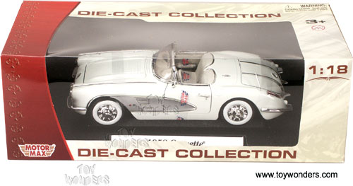 73109W MOTORMAX - 1958 Chevrolet Corvette Convertible. 1:18 scale diecast model car. This 1958 Chevy Corvette measures 9.75" long x 3.75"W x 2.5"H. Diecast metal, free wheeling, steerable front wheels. Detailed engine and interior. Opening doors/hood/trunk. This 58 Chevy is a classic American car and is mounted on a plastic platform stand. Individually packed in a window box. Box size: 14.25"Wx 5.25"Hx 6.25"D. This 1957 Chevy Corveete is from Motor Max. 73109 in WHITE color. GM is a trademark of the General Motors Corporation.