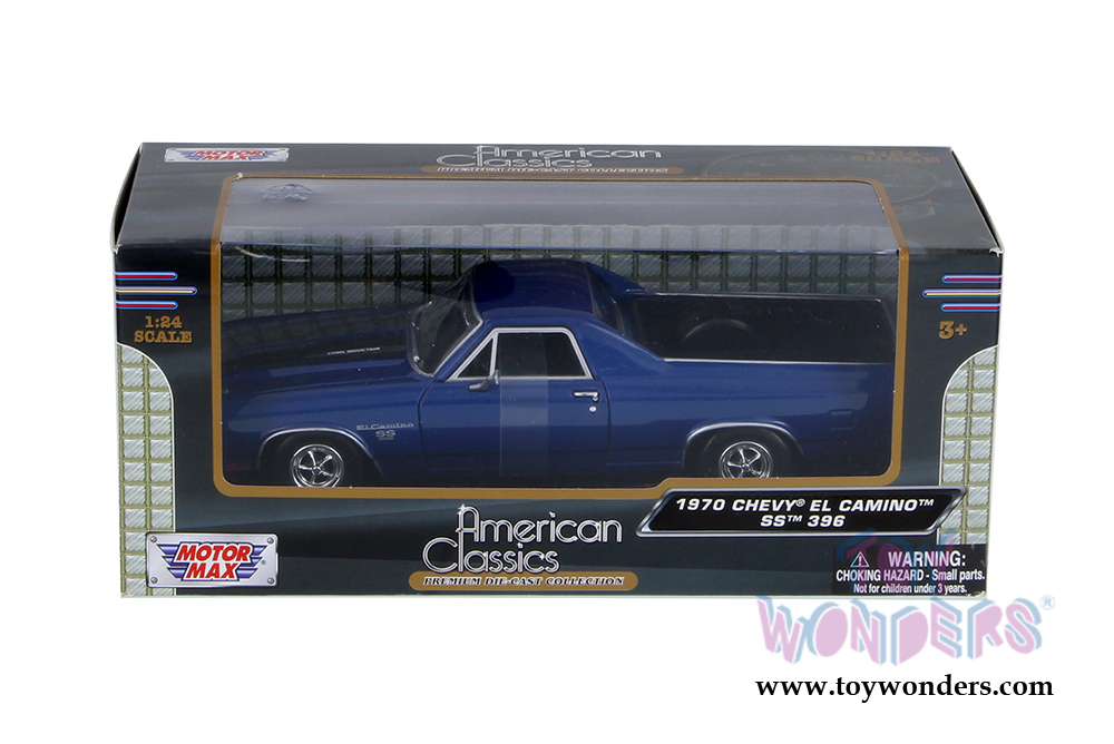 79347AC/BU Motormax - 1970 Chevy El Camino™ SS 396 Hardtop. 1:24 scale diecast collectible model car. This Chevrolet El Camino is an 8.75"L x 3"W x 2.5"H diecast metal with openable doors and freewheeling. This 1970 Chevy El Camino is manufactured by Motormax. 79347AC/BU is in BLUE color. Individually packed in a window box. Window Box size: 9.75"Lx 4.25"Wx 4"H. GM is a trademark of the General Motors Corporation.