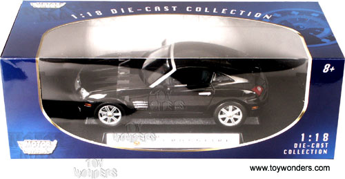 73121BK MOTORMAX - 2003 Chrysler Crossfire Hard Top. 1:18 scale diecast model car. 8.5"L x 4.5"W x 2.5"H diecast metal car with free wheeling, steerable front wheels, detailed engine and interior, and opening doors/hood/trunk. Sits on a display plaque. Individually packed in a window box. Box measures 14"L x 6.25"W x 4.75"H. Manufactured by Motor Max. 73121 in BLACK color.