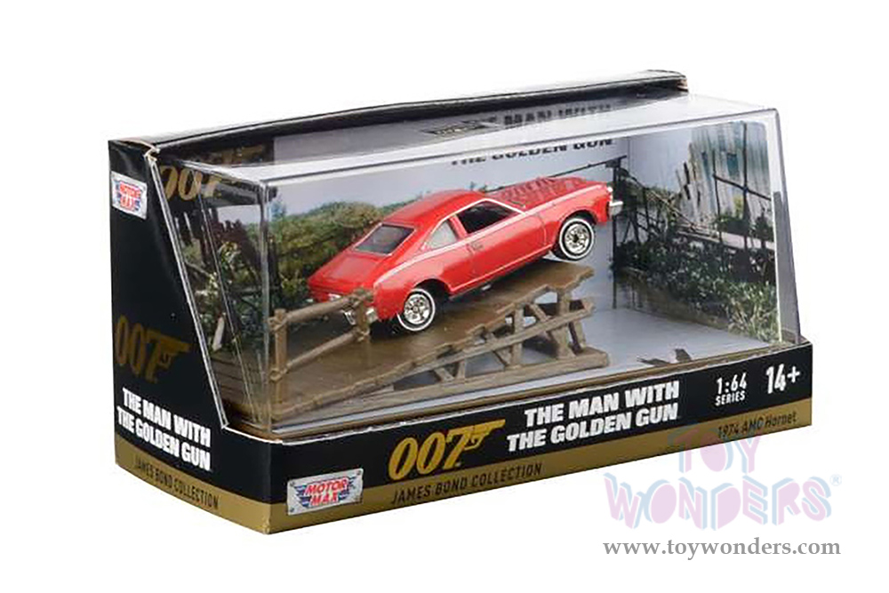 79822 Motormax Dioramas - 1974 AMC Hornet James Bond 007 "The Man with the Golden Gun" (1974) Movie. 1:64 scale diecast collectible model car with some plastic parts. This AMC is a 3" long die cast metal car. Does not have any openings. Authentic James Bond scenery & base makes for a realistic 007 Showpiece. The AMC Hornet is manufactured by Motor Max Toys. Comes in plastic display showcase. Box size: 6"Lx 3"Wx 3"H. 79822 is in red with white stripes.