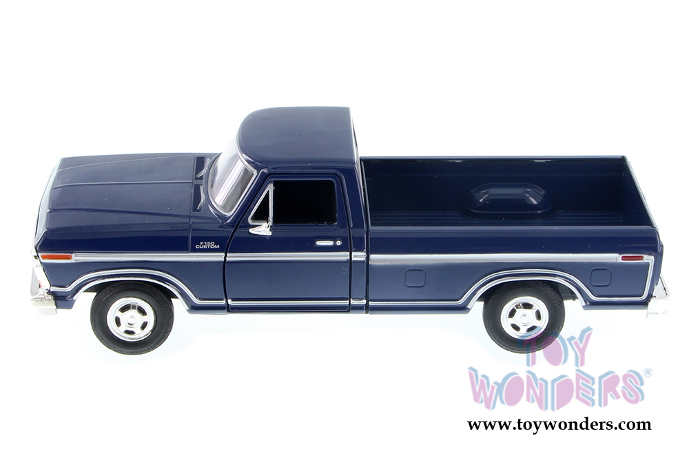 79346AC/BU Motormax - 1979 Ford F-150 Custom Pickup Truck. 1:24 scale diecast collectible model car. This Ford F-150 Pickup is a 9"L x 3.5"W x 3"H diecast metal with openable doors and freewheeling action. The 1979 Ford F-150 Custom Pickup Truck is manufactured by Motormax. 79346AC/BU is in BLUE color. Individually packed in a window box. Window Box size: 9.75"L x 4.25"W x 4"H. GM is a trademark of the General Motors Corporation.