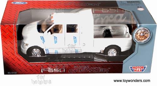 73103W MOTORMAX - Ford F-650 Super Crewzer Pickup. 1:18 scale diecast collectible model car. This Ford F650 Pick up is an 11"Lx 4.25"Wx 3.75"H die cast metal car with steerable front wheels and openable doors & hood. Tow hitch in center of pick-up bed. It sits on a display plaque. This Ford F 650 is manufactured by Motor Max. Individually packed in a window box. Box size: 14.25"Lx 6.25"Wx 5.25"H. 73103 in WHITE color.