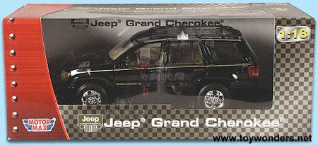 73123BK MOTORMAX - Jeep Grand Cherokee. 1:18 scale diecast collectible model car. This Jeep Grand Cherokee is a 9.5"Lx 4.25"Wx 3.5"H diecast SUV with openable doors & hood and workable steering. Free wheeling. This Jeep sports utility vehicle is manufactured by Motor Max. Display platform. 73123 in BLACK color.