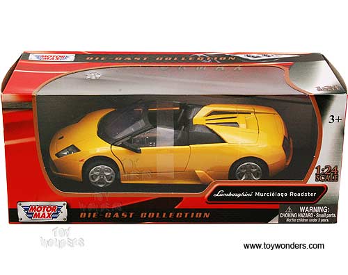 73316YL/6 MOTORMAX - Lamborghini Murcielago Roadster Convertible. 1:24 scale diecast collectible model car. This Lamborghini is 7.5"L x 3.25"W x 1.75"H diecast metal plastic with freewheeling, openable doors, and trunk. Manufactured by Motor Max Toys. Each individually packed in a window box. Window Box size is 9.75"Lx4.3"Wx4"H. 73316 in YELLOW color.