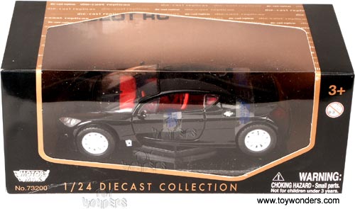 73287BK MOTORMAX Peugeot RC Sports Car. 1:24 scale diecast collectible model car. 7"Lx 3"Wx 2"H diecast metal car with free wheeling, steerable front wheels, and opening doors/hood/trunk. Individually packed in a window box WB. Box measures 9.5"Lx 4"Wx 4"H. Manufactured by Motor Max. 73287 in BLACK color.