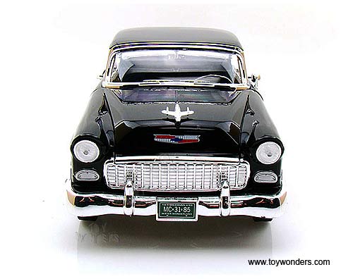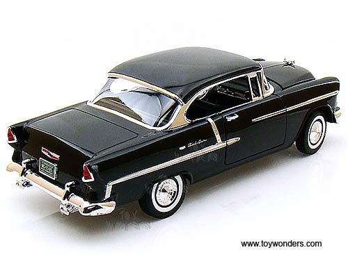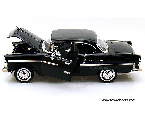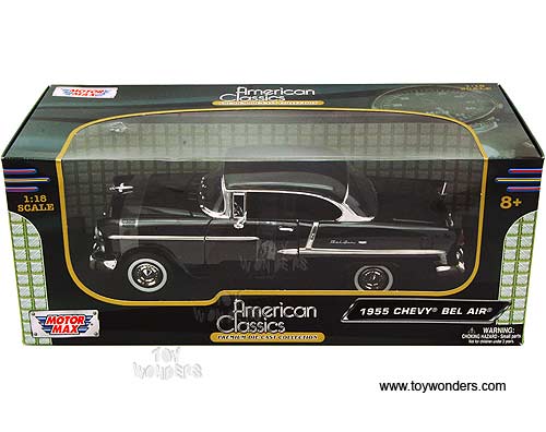 73185BK/4 Motormax Premium American Classics - 1955 Chevy Bel Air Hard Top. 1:18 scale diecast collectible model car. This 55 Chevrolet Belair measures 10.5"L x 4"W x 3"H diecast classic car with open able doors & hood, steerable front wheels, detailed engine and interior. This 55 Chevy Bel Air is manufactured by Motor Max Toys. 73185 is in BLACK. Sits on a display plaque. Individually packed in a window box. Box size: 14"Lx 6.25"Wx 5.5"H. GM is a trademark of the General Motors Corporation.