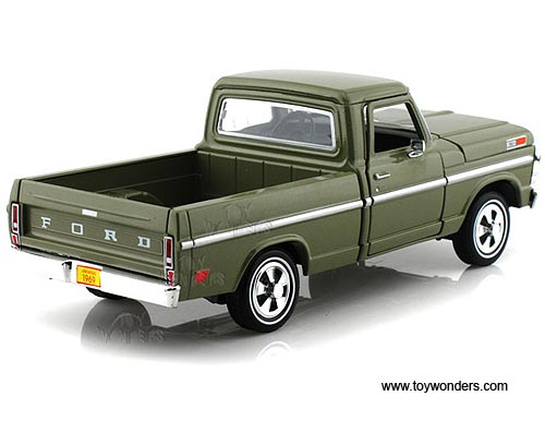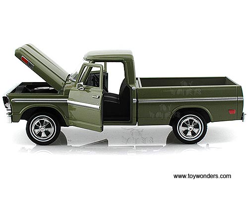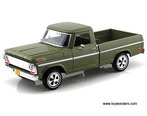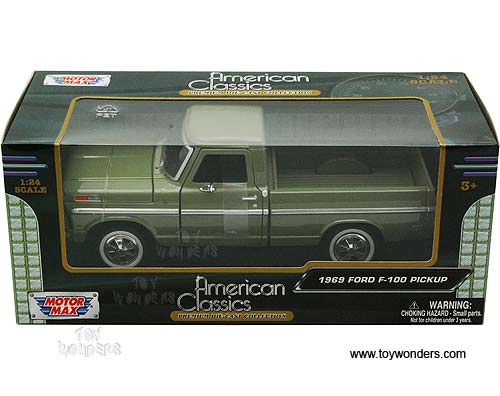 79315AC/GN Motormax Premium American Classics - 1969 Ford F-100 Pickup truck. 1:24 scale diecast collectible model car. This 69 Ford F100 pickup measures 8"L x 3.25"W x 3"H diecast classic car with openable doors and hood. This 1969 Ford F 100 pickup is manufactured by Motor Max Toys. 79315 is in GREEN color. Individually packed in a window box. Window Box size: 9.75"Lx 4.5"Wx 4"H.