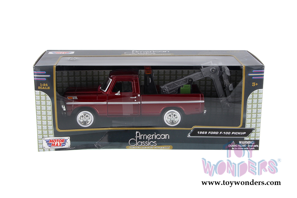 75345AC Motormax Premium American Classics - 1969 Ford F-100 Pickup Tow Truck. 1:24 scale diecast collectible model car with some plastic parts. This 1937 Ford is a 7.5"L x 3"W x 3"H diecast metal pickup truck with opening doors, hood, and workable steering. Rubber tires, detailed interior, and exterior. Manufactured by Motormax. 75345AC is in BURGUNDY color. Packed in a window box. Window Box size: 12"L x 4.5"W x 4.75"H.