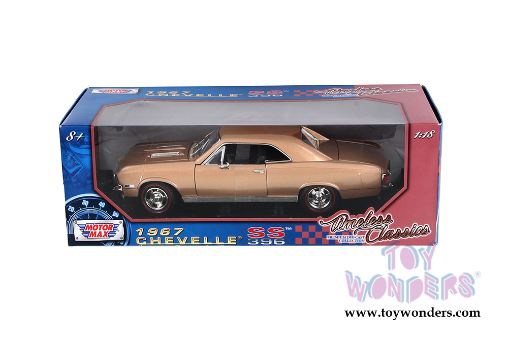 73104TC/BN Motormax Timeless Classics - 1967 Chevelle SS396 Hardtop. 1:18 scale diecast model car. This 1967 Chevelle SS396 is a 10.5"L x 3.5"W x 3"H diecast classic car with openable doors, hood, and trunk. Featuring steerable front wheel, detailed engine and interior. This 1967 Chevelle is manufactured by Motor Max. Sits on a display plaque. Individually packed in a decorated window box. Window Box measures 14"Lx 6.25"Wx 5.5"H. Item 73104TC/BN is in BROWN color.