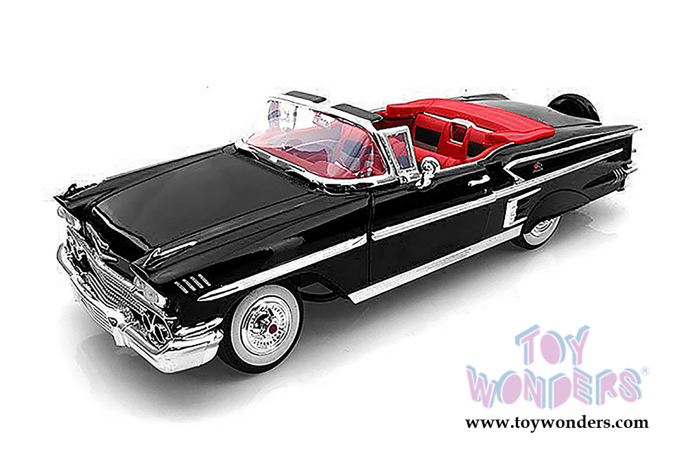 73112TC/BK Motormax Timeless Classics - 1958 Chevrolet Impala Convertible. 1:18 scale diecast model car. This 1958 Chevy Impala measures 11"L x 4"W x 2.75"H, diecast classic car with opening doors/hood/trunk. This 1958 Impala features steerable front wheel, detailed engine and interior. This '58 Chevy Impala Convertible is manufactured by Motor Max Toys.  Sits on a display plaque. Individually packed in a decorated window box. Box measures 14"Lx 6.25"Wx 5.5"H. 73112TC/BK is in BLACK.
