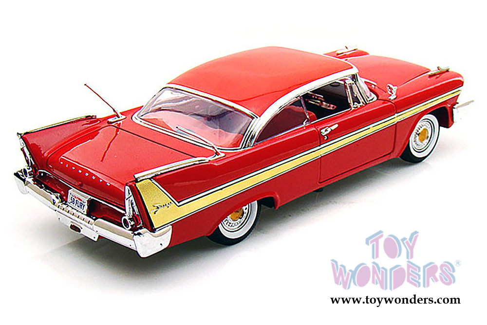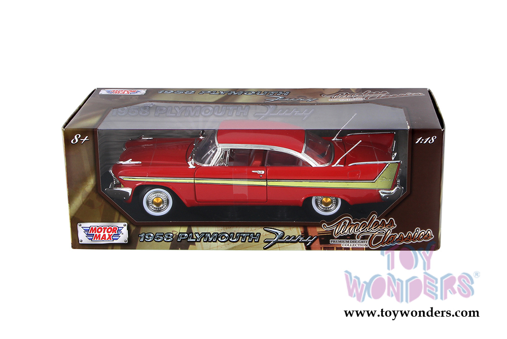 73115TC/R Motormax Timeless Classics - 1958 Plymouth Fury Hard Top. 1:18 scale diecast collectible model car. This 58 Plymouth Fury measures 11.25"L x 4"W x 2.75"H diecast classic car with open able doors, hood & trunk, steerable front wheels, detailed engine and interior. This Plymouth Fury is manufactured by Motor Max Toys. Sits on a display plaque. Individually packed in a decorated window box. Box measures 14"Lx 6.25"Wx 5.5"H. Item 73115TC/R is in RED color.
