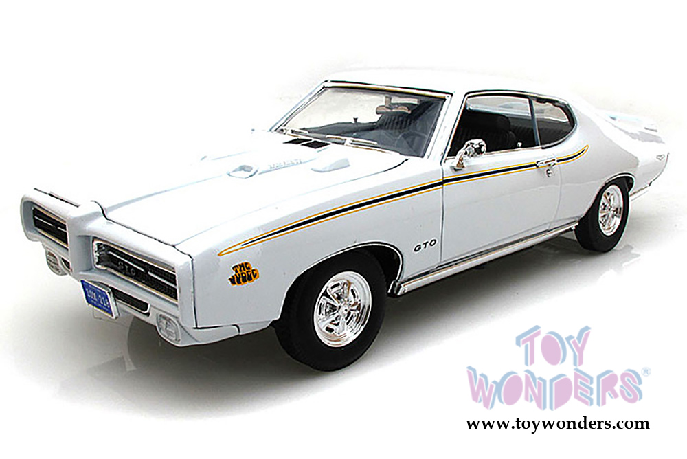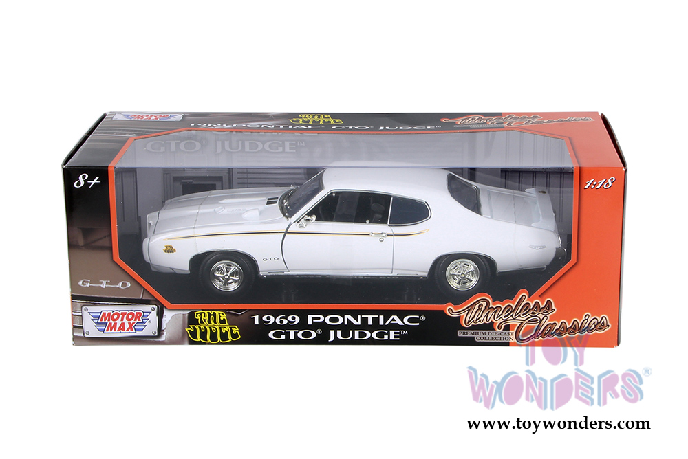 73133TC/W Motormax Timeless Classics - 1969 Pontiac GTO Judge Hard Top. 1:18 scale diecast collectible model car. This Pontiac GTO is a 10.5"L x 4"W x 2.75"H diecast muscle car with openable doors, hood & trunk. Workable steering, sits on a display plaque. This Pontiac GTO Judge is manufactured by Motor Max Toys. 73133TC/W is in WHITE color. Individually packed in a window box. Box size: 14"L x 6.25"W x 4.75"H. GM is a trademark of the General Motors