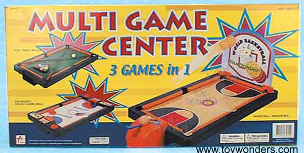 8703T Multi Game Center 3 in 1. Three games in one: pool table, ice hackey, & basketball. box size: 22.5"Lx3.5"Wx11"H.