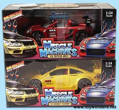 73111A Muscle Tuner-Honda/Toyota. 1:24 scale diecast model car. Assorted in Honda Accord (7.75"L) & Toyota MR2 Spyder (6.5"L). Opening doors/hood/trunk. Sound system installation. Detailed interior. Muscle Machine. Manufactured by Funline. Honda: asstd. BLUE & YELLOW. Toyota Spider: asstd. RED & Charcoal GREY. Individually packed in a window box WB.