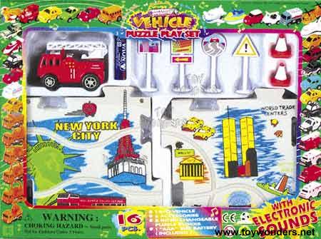 9981MENY Puzzle Vehicle Set. Red Fire Engine vehicle with GO-NEW YORK CITY track designs only. Tracks in assorted colors. Amaze your customers and friends with the puzzle vehicle sets. Put your puzzle pieces together in any one of the many possible configurations. Then power up your vehicle and watch it run on top of the puzzle tracks. People will watch in wonder how the vehicle stays on the puzzle pieces. Great attention getter when demonstrated! Another bonus aspect of this product is that customers will often purchase multiple sets and assemble them together to make a really big puzzle track. Includes: 2.25" battery operated fire engine, one "AAA" battery, eight 5"x5" puzzle pieces, four road signs, and two traffic cones. Fire Engine has a switch on it that allows you to play music/sounds. A third setting on the switch allows you to run the vehicle without the sounds. Box size: 12"W x 8.75"H x 1.75". 12 pcs/inner.