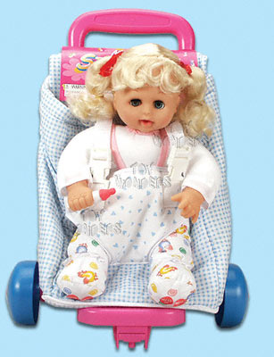 PT1702 Musical Stroller. 18" blond soft doll in stroller that conveniently converts into backpack. Eyes open & shut. Pkg.size: 12"Lx7"Wx18"H. 6 pcs/inner.