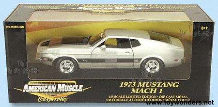 36673LS ERTL Ford Mustang Mach 1 (1973). 1:18 scale diecast model. This 1973 Ford Mustang is a 10.25" long x 3.75"W x 2.75"H diecast metal classic muscle car with workable steering, free wheels, folding seats, and opening doors/hood. Detailed engine & components. Sits on a display platform. Box measures 13.5"W x 5.75"H x 6.25"D. This 73 Ford Mustand is manufactured by American Muscle Classics. SILVER color with BLACK racing stripes and BLACK tone hood.