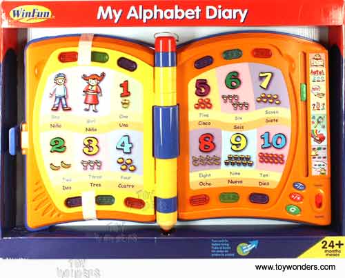 9041/B1 Battery Operated My Alphabet Diary Book. 17.75" x 11.75" bilingual alphabet flip-page diary (English / Spanish) with creative games. It features 8 learning activity modes (alphabet, words, spelling, numbers, objects, music and games), alphabet song sing-along, 10 cheerful melodies, 12 flashing buttons and sound effects, and built-in handle. Requires 3 "AA" batteries (included). Box size: 18.5"L x 14.75"W x 2.25"H. 6 pcs/inner.