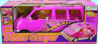 883D My Deluxe Camper with Doll. 19.25" camper van w/ openable rear door, adjustable seats and enough room to seat four dolls. Includes one fashion doll. Box size: 22.5"Lx 10"Wx 9"H.