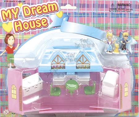 9339 My Dream House. 9.5" wide x 4.5" high (unfolded) dream house with furniture, accessories, 2 people figures, animal figure. Dream house folds up and has a handle. Assorted colors/styles: kitchen, bedroom, bathroom, night club. Card size: 10.5" x 9"