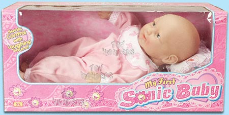 10253 My First Sonic Baby Laugh. 18" baby doll with sonic control laughing sound. On/Off switch box. Requires: 2 "AA" batteries (not included). Box size: 18.25"Lx8.75"Wx4"H.