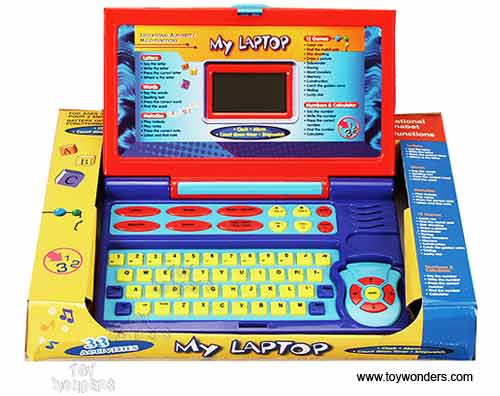 852V Battery Operated My Laptop. Educational alphabet / multi-functions computer features 33 activities, clock, alarm, count down timer, letters, words, 12 games, melodies, numbers & calculator. This PC is for ages 3+ years. Includes 3 "AA" batteries. Box size: 13"Lx 9.5"Wx 2.3"H.