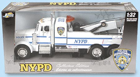 5011NY JADA NYPD police Tow Truck, 1:32 scale diecast model car. 11" long x 3"W x 4.5"H. This police tow-truck is free wheeling with opening doors/trunk and workable & extendable tow. This WHITE and BLUE NYPD tow has detailed engine & components. This New York Police Department vehicle is a collector's edition. Manufactured by Jada Toys. 8 pcs per inner box. Individually packed in a window box.