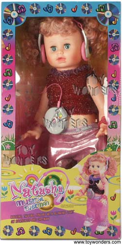 1687SCD Natasha Musical Discman. 16.5" Walking, talking, singing vinyl doll, moves head/arms with flashing lights on the bracelets, speaks Spanish. Requires 3 "AA" batteries (included). Box size: 9"L x 5"W x 18"H. 6 pcs/inner.