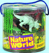 R2 Nature World: Zoo, Farm, and Dinosaur Assortment. The Nature World assortments consist of three different styles. The zoo animals assortment includes lion, tiger, monkey, zebra, trees, etc. Farm assortment includes cow, pig, horse, sheep, fences, trees, etc. Dinosaurs include tyrannosaurus, pterodactyl, and other carnivorous and herbivorous reptiles, trees, plants, etc. All assortment comes with a colorful play mat to set up your figures. Packaged in a clear plastic tube container that measures 5" in diameter and 5" in height. 12 pcs/inner.