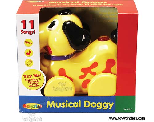 63977F Navystar Toys - Musical Doggy. 8.5" dog features roll along action. Press buttons to play 11 songs with light. Includes 2 "AA" batteries. Ages 18 months & up. Box size: 9"L x 4"W x 8.125"H.
