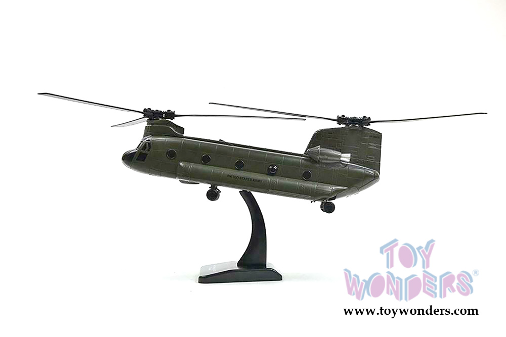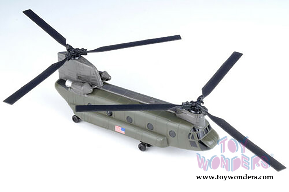 25793 New Ray - Sky Pilot Boeing CH-47 Chinook Helicopter. 1:60 scale diecast model helicopter. This is a 19.75"L x 3.5"W x 3.75"H diecast aircraft. These helicopters are diecast metal and plastic construction. Individually packed in a window box WB. Box size: 14"L x 4"W x 5"H. 25793 is in Green.