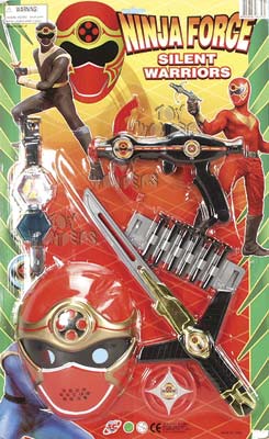 8353/4 Ninja Force Set. Silent warrior costume equipment includes: mask, 13.5" sword, shuriken, suction cup dart gun, dart bandolier with 6 darts and communicator watch. Blister card measures 22" x 13.5". In 2 assorted styles with different swords. Ninja force play set.12 sets per inner.