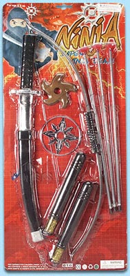 616 Ninja Set. Ninja costume set includes: Ninja Sword, bow and 3 arrows, Ninja stars, and nunchucks. Card size: 11.25"x24.75".
