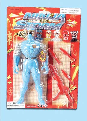57297A Ninja set w/assorted weapons. Ninja also come in asstd. colors: blue, yellow, white, red, & black. They also have light up eyes. Card size: 11.5"x8.25". 24 pcs/inner.
